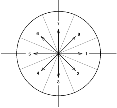В настоящем исследовании описанная неточность приводила к тому, что часть векторов, вычисленных по очень малым сдвигам (один из них измерен как 0), ошибочно пролагались на экране параллельно координатным осям и попадали не в свой статистический класс (см. рис.1,В). За счёт этого относительная доля векторов, параллельных осям (направления №1,3,5,7 на рис.1,В) оказывалась непропорционально большой в ущерб диагональным направлениям №2,4,6,8. Для минимизации данного артефакта при подсчёте статистики использовалась пороговая длина вектора, т.е. векторы, вычисленные по двум слишком малым сдвигам, автоматически исключались из анализа - причём не только типа "0, 1" или "1, 0"…, но и для равновесия "1, 1", "1, -1" …