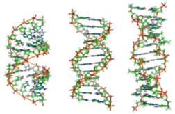 В зависимости от концентрации ионов и нуклеотидного состава молекулы, двойная спираль ДНК в живых организмах существует в разных формах. На рисунке (слева направо) представлены A, B и Z формы