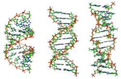 Три Конформации ДНК, как полагают, можно найти в природе, А-ДНК, В-ДНК, и Z-ДНК. "B" форма, изложенная Джеймсом Уотсон и Фрэнсисом Криком, преобладает в клетках. Двойная спираль совершает один полный оборот вокруг своей оси каждые 10.4-10.5 баз пар в растворе. Эта частота вращения в значительной степени зависит от укладки силы, так что каждая база оказывается в цепи своих соседей.
