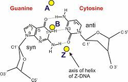 A-ДНК-и Z-ДНК существенно различаются по своей геометрии и габаритам от B-ДНК, хотя они представлены в виде спиральных структур. Форма А, судя по всему, появляется только в обезвоженных образцах ДНК, как, например, те, которые используются в кристаллографических экспериментах, и, возможно, в гибридных парах ДНК и РНК пряди. Сегменты ДНК, которые клетки денатурируют для целей регулирования может принять Z геометрия, в которой нити закручены противоположно винтовой оси А-ДНК и B-ДНК. Существует также данные о ДНК-белковых комплексов формировании Z-ДНК структур.
