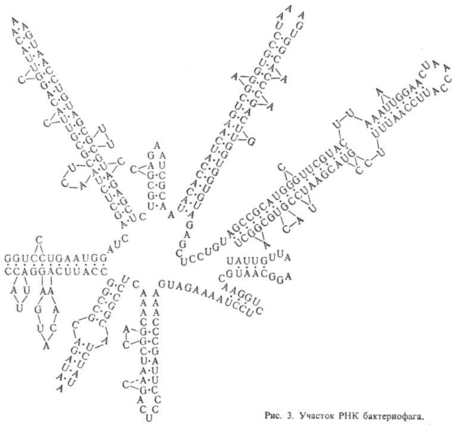 Рибонуклеиновые кислоты. РНК, как правило, построены из одной полинуклеотидной цепи, характерный элемент вторичной структуры к-рой - "шпильки", перемежающиеся однотяжевыми участками (рис. 3). Шпилька - двутяжевая спиральная структура, образующаяся в результате комплементарного спаривания оснований (А с U и G с С). Шпильки и соединяющие их одно-тяжевые участки РНК укладываются в компактную третичную структуру. Для тРНК вторичная структура имеет характерную форму, которую называют "клеверным листом". Известны редкие примеры целиком двухспиральных молекул РНК.