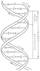 Пространственная структура ДНК описывается как комплекс двух полинуклеотидных антипараллельных цепей, закрученных относительно общей оси, так что углеводо - фосфатные цепи составляют периферию молекулы, а азотсодержащие гетероциклы направлены внутрь (двойная спираль Уотсона-Крика). Антипараллельность полинуклеотидных цепей выражается в том, что на одном и том же конце спирали одна полинуклеотидная цепь содержит (незамещенную или замещенную) группу 5'-ОН, а другая 3'-ОН. Фундаментальное свойство двойной спирали ДНК состоит в том, что ее цепи комплементарны друг другу вследствие того, что напротив А одной цепи всегда находится Т другой цепи, а напротив G всегда находится С. Комплементарное спаривание А с Т и G с С осуществляется посредством водородных связей. Классическая двойная спираль Уотсона-Крика получила название В-формы ДНК. Она - правозакрученная, плоскости гетероциклических оснований перпендикулярны оси спирали, а число пар остатков нуклеотидов на один виток спирали равно примерно 10; расстояние между витками 3,4 нм. При изменении ионной силы и состава растворителя двойная спираль изменяет свою форму и даже может превращаться в левозакрученную спираль (так называемую Z-форму), которая содержит в одном витке около 12 остатков нуклеотидов. При дегидратации В-формы образуется А-форма ДНК - правозакрученная двойная спираль, содержащая в одном витке около 11 остатков нуклеотидов, плоскости гетероциклических оснований повернуты примерно на 20° относительно перпендикуляра к оси спирали. Двойная спираль ДНК способна денатурировать (например, при повышении температуры) с полным расхождением комплементарных цепей, которые сохраняют способность к ассоциации с восстановлением (рекатурацией) двойной спирали при возвращении к исходным условиям. Подробно изучены также конформации фрагментов ДНК.