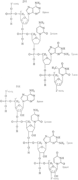 Первичная структура нуклеиновых кислот представляет собой последовательность остатков нуклеотидов. Последние в молекуле нуклеиновых кислоты образуют неразветвленные цепи. В зависимости от природы углеводного остатка в нуклеотиде (D - дезоксирибозы или D-рибозы) Н.к. подразделяют соответственно на дезоксирибонуклеиновые (ДНК) и рибонуклеиновые (РНК) кислоты. В молекуле ДНК гетероциклы, входящие в остаток нуклеотида, представлены двумя пуриновыми основаниями - адeнином (А) и гуанином (G), и двумя пиримидиновыми основаниями -тимином (Т) и -цитозином (С); РНК вместо Т содержит урацил (U). Кроме того, в Н.к. в небольших количествах обнаруживаются модифицированные (в основе метилированные) остатки нуклеозидов - так называемые минорные нуклеозиды, которыми особенно богаты транспортные рибонуклеиновые кислоты (тРНК). Отдельные нуклеотидные остатки связаны между собой в полинуклеотидных цепях 3'-5'-фосфодиэфирными связями. Стандартная запись нуклеотидной последовательности осуществляется в направлении от 5'-конца к 3'-концу (каждый нуклеотид обозначают буквой, присвоенной основанию, которое он содержит; направление, последовательность приведенного участка ДНК записывается как ACGT).