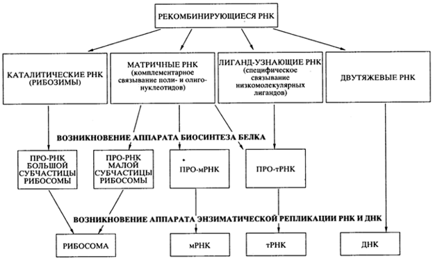 Во-первых, постулируется, что абиогенно синтезируемые олигорибонуклеотиды активно рекомбинировали посредством механизма спонтанной неэнзиматической трансэстерификации, приводя к образованию удлиненных цепей РНК и давая начало их многообразию. Именно этим путем в популяции олигонуклеотидов и полинуклеотидов и могли появиться как каталитически активные виды РНК (рибозимы), так и другие виды РНК со специализированными функциями (см. рис. 7). Более того, неэнзиматическая рекомбинация олигонуклеотидов, комплементарно связывающихся с полинуклеотидной матрицей, могла обеспечить сшивание (сплайсинг) фрагментов, комплементарных этой матрице, в единую цепь. Именно таким способом, а не катализируемой полимеризацией мононуклеотидов, могло осуществляться первичные копирование (размножение) РНК. Разумеется, если появлялись рибозимы, обладавшие полимеразной активностью, то эффективность (точность, скорость и продуктивность) копирования на комплементарной. В матрице должна была значительно возрастать.