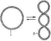 Сверхспирализация двухцепочечной кольцевой ДНК под действием ДНК-гиразы: 1 - кольцевая форма ДНК; 2 - сверхспирализованная форма ДНК.