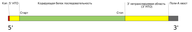 Зрелая мРНК состоит из нескольких участков, различающихся по функциям: «5' кэп», 5' нетранслируемая область, кодирующая (транслируемая) область, 3' нетранслируемая область и 3' полиадениновый «хвост».