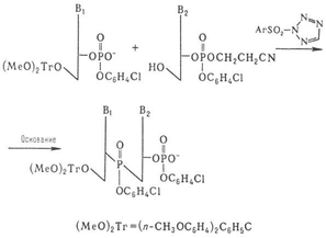 Образующийся динуклеотид далее (после частичного деблокирования фосфата) конденсируют аналогичным образом с другим динуклеотидом и т.д. Применение этого способа, в котором используют защиту фосфатной группы, позволило значительно сократить время синтеза и повысить выходы олигонуклеотидов.