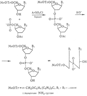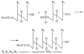 К динуклеотиду со своб. 3'-гидроксильной группой присоединяют таким же способом динуклеотид с незащищенной 5'-фосфатной группой и т.д. (блочный метод синтеза):