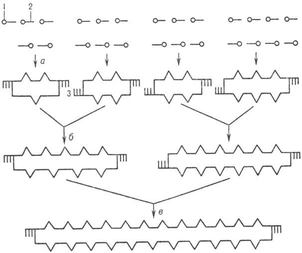 Схема синтеза полидезоксинуклеотида: 1,- соотв. 5'- и 3'-конец олигонуклеотидов; 3-комплементарные участки концов дуплексов (:липкие: концы); а,б и в-стадии образования дуплексов (все стадии катализируются Т4 ДНК-лигазой).