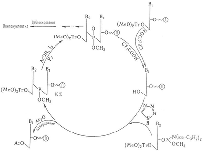 Наиболее распространенные методы твердофазного синтеза олигонуклеотидов основаны на использовании нуклеотидного компонента, содержащего Р(III). В амидофосфитном способе нуклеотидным компонентом является эфир 3'-амидофосфита дезоксинуклеозида. Достаточно устойчивые амидофосфиты при протонировании в присутствии тетразола превращаются в сильные фосфорилирующие агенты. Схема также включает блокирование непрореагировавшей 3'-гидроксигруппы достраивающегося олигонуклеотида (кэпирование) и окисление межнуклеотидного фосфита. После завершения синтеза удаляют защитные группы с межнуклеотидных фосфатов, отделяют олигонуклеотид от носителя, деблокируют группы NH2 гетероциклов. Липофильную группу (МеО)2Тr удаляют после первого хроматографические разделения.