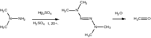 Другой способ количественного нахождения НДМГ заключается в определении формальдегида, образующегося по реакции окисления НДМГ сульфатом ртути (II) в серной кислоте. Нагревание в колбе с обратным холодильником НДМГ в течение 20 ч при температуре 90°С вполне достаточно для количественного автоокисления небольшого количества НДМГ и гидролиза продукта его окисления – тетраметилтетразена – до формальдегида. На каждый моль НДМГ образуется 2 моль НСНО.