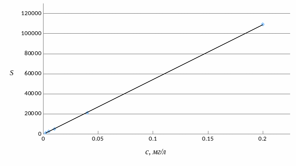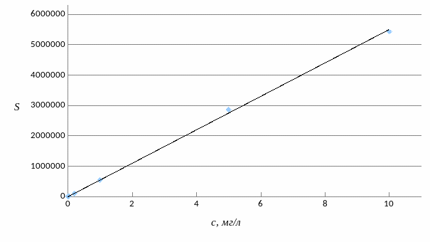 Градуировочная зависимость аналитического сигнала детектора (площадь под пиком) от концентрации является линейной во всем исследуемом диапазоне (рис 4) и описывается уравнением y = (5.49±0.09)×106c (P = 0.95 n = 8), причем обработка результатов методом наименьших квадратов (МНК) показывает высокую сходимость результатов (коэффициент корреляции, r = 0.9997). Таким образом, апробируемый подход дает возможность вести определение в широкой области концентраций (5 порядков концентрации).