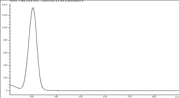 Конечный продукт реакции дериватизации – 1,1-диметилгидразон глиоксаля имеет один выраженный максимум поглощения при λ = 310 нм (рис. 2), что связано с наличием сопряжённой связи N=C–C=O.