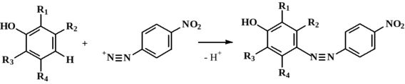 В качестве диазосоставляющей в реакции азосочетания использовали тетрафторборат 4‑нитрофенилдиазония. Выбор реагента обусловлен его устойчивостью в твердом виде и в водных растворах, высокой скоростью протекания реакции азосочетания и интенсивной окраской образующихся азосоединений в водном растворе (n·103).