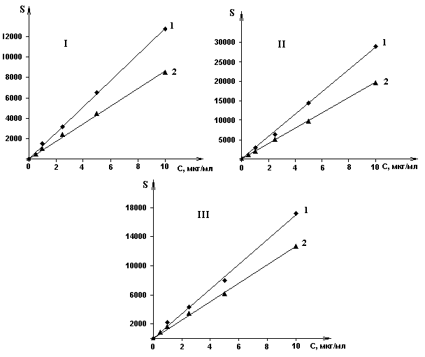 Уравнения градуировочных прямых S=a×Cсоед. и коэффициенты корреляции линейной зависимости представлены в табл.8.