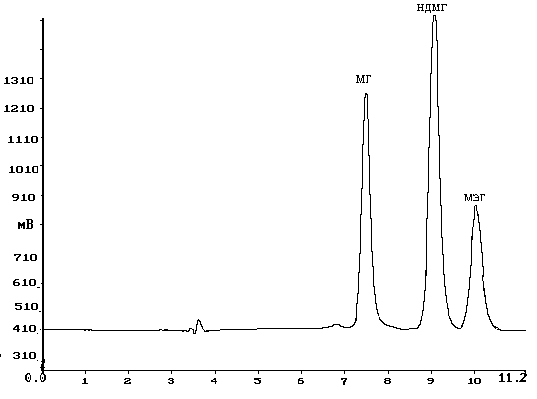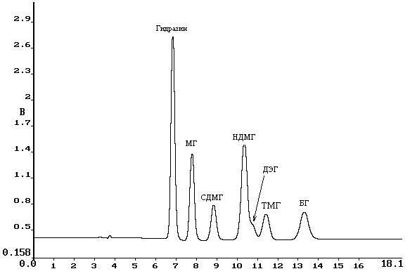 Рис. 9. Хроматограмма разделения смеси компонентов: метилгидразин, НДМГ,