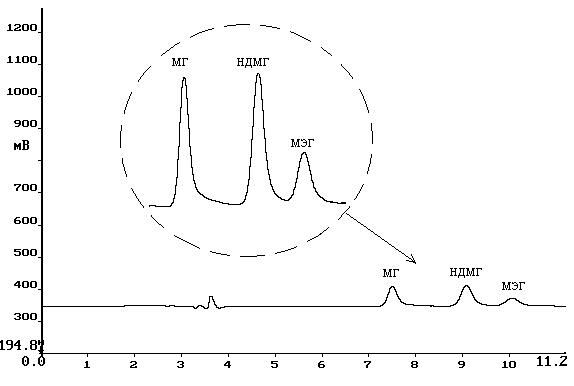 Линейность градуировочного графика сохраняется в области содержаний: при подвижной фазе 100мМ ААБ для МГ 0,005-10 мкг/мл, для НДМГ 0,018-10 мкг/мл, для МЭГ 0,07-10 мкг/мл, при подвижной фазе 100мМ ААБ + 20% MeOH для МГ 0,008-10 мкг/мл для НДМГ 0,008-10 мкг/мл. для МЭГ 0,02-10 мкг/мл.