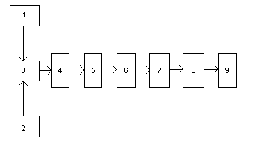 1 – Высоковольтный источник питания, 2 - питание накала,3 – рентгеновская трубка, 4 – образец, 5 – анализатор, 6 – детектор, 7 – дискриминатор, 8 пересчетное устройство, 9 – ЭВМ.