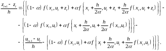 слева направо и в каждое из двух выражений, собранных в фигурных скобках, добавили одно и то же слагаемое. Поскольку между фигурными скобками стоит знак минус, значение правой части формулы 416 в целом при этом не меняется. Однако благодаря таким преобразованиям мы собрали во вторых фигурных скобках члены, которые дают погрешность аппроксимации дифференциального уравнения