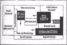 Current implementations use an integrated set of crossplatform tools such as electronic notebooks, video conferencing systems, electronic whiteboards, shared screens, information-access tools, and instrument-control tools. Figure 1 illustrates how different tools provide varying functionality in interactions depending upon the static or dynamic nature of the information exchange as well as upon the synchronous or asynchronous nature of the session.
