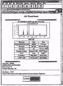 • Shared electronic notebook. Collaborators can share this electronic version of a traditional paper laboratory notebook. Electronic notebooks provide distributed access to data, as well as automated data entry, searching, and other information processing not possible in a paper notebook. The current EMSL notebook creates a dynamic Web page that can be queried, display experiment information, and accept multimedia user annotations. The Web page provide the data files, an image, or a live Java-based graphical summary of the data in each file, and information about each file (such as the instrument parameters used, operator's name, and date). Information from instruments that is sent to the enterprise database/archive system is queried to provide automatic updates to the electronic notebook. Users may query to select a subset of files to by displayed by sample, date, and owner name. They can also easily add text, picture, and file annotations to the original information. Figure 2 shows a sample notebook page.