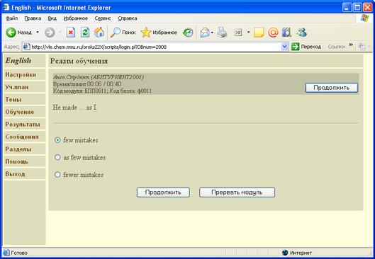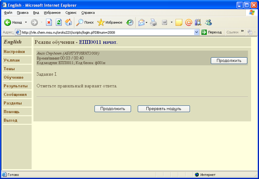 | Прервать модуль | Прервать работу с модулем в режиме обучения и выйти в окно со списком модулей. |