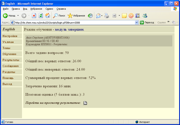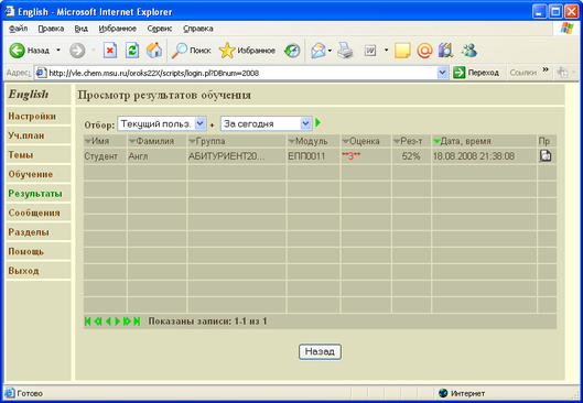 Также результаты обучения Вы можете посмотреть и через пункт меню "Результаты" (Рис. 11).