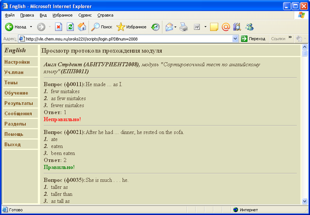 Вы можете посмотреть свой протокол тестирования, в котором отражены правильные и неправильные ответы. Для этого щелкните на изображение, расположенное в столбце "Пр", соответствующего теста. Раскроется протокол, примерный вид которого представлен на Рис. 12