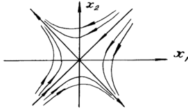 Точка называется "седлом". Точка вначале идет к центру, но затем переходит на другую прямую и уходит в