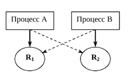 Возникновение так называемых тупиков (deadlocks). Рассмотрим следующую ситуацию (см. Рис. 3): имеются процессы А и В, каждому из которых в некоторый момент требуется иметь доступ к двум ресурсам R1 и R2. Процесс А получил доступ к ресурсу R1, и следовательно, никакой другой процесс не может иметь к нему доступ, пока процесс А не закончит с ним работать. Одновременно процесс В завладел ресурсом R2. В этой ситуации каждый из процессов ожидает освобождения недостающего ресурса, но оба ресурса никогда не будут освобождены, и процессы никогда не смогут выполнить необходимые действия.