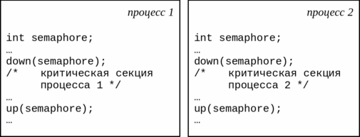 Первый из таких подходов был предложен Дейкстрой в 1965 г. Дейкстра предложил новый тип данных, именуемый семафором. Семафор представляет собой переменную целого типа, над которой определены две операции: down(P) и up(V).2 Операция down проверяет значение семафора, и если оно больше нуля, то уменьшает его на 1. Если же это не так, процесс блокируется, причем операция down считается незавершенной. Важно отметить, что вся операция является неделимой, т.е. проверка значения, его уменьшение и, возможно, блокирование процесса производятся как одно атомарное действие, которое не может быть прервано. Операция up увеличивает значение семафора на 1. При этом, если в системе присутствуют процессы, блокированные ранее при выполнении down на этом семафоре, ОС разблокирует один из них с тем, чтобы он завершил выполнение операции down, т.е. вновь уменьшил значение семафора. При этом также постулируется, что увеличение значения семафора и, возможно, разблокирование одного из процессов и уменьшение значения являются атомарной неделимой операцией.