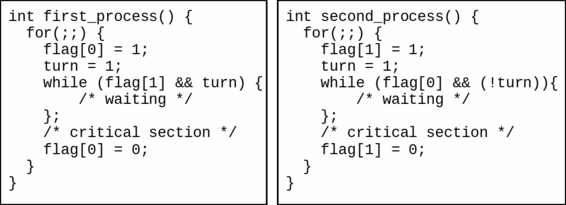 Элементы массива flag символизируют собой желание соответствующего процесса попасть в критическую секцию. Каждый из процессов видит все элементы массива flag, но модифицирует только «свой» элемент. Переменная turn устанавливает очередность прохождения критической секции при обоюдном желании процессов вступить в нее. Благодаря тому, что каждый из процессов прежде всего устанавливает флаг очередности в пользу другого процесса, исключается ситуация «монополизации» ресурса одним из процессов и вечного блокирования второго.