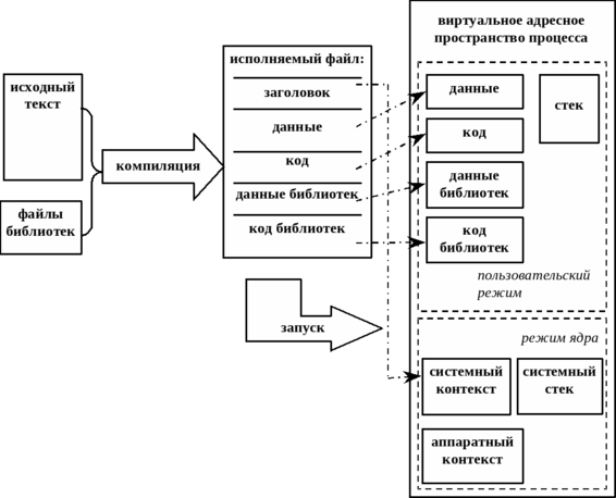 Так как любой процесс может в различные моменты своего выполнения находиться как в привилегированном режиме, так и в пользовательском режиме, то и виртуальное адресное пространство процесса состоит из двух частей: одна из них используется, когда процесс находится в пользовательском режиме, а другая – в привилегированном. Причем процессу, находящемуся в пользовательском режиме, недоступна та часть его виртуального адресного пространства, которая соответствует режиму ядра. На Рис. 8 показано отображение исполняемого файла на виртуальное адресное пространство процесса, которое производит ОС при запуске процесса.