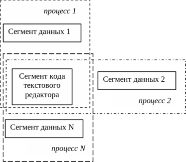 Некоторые современные ОС имеют возможность разделения единого сегмента кода между разными процессами. Тем самым достигается экономия памяти в случаях одновременного выполнения идентичных процессов. Например, при функционировании терминального класса одновременно могут быть сформированы несколько копий текстового редактора. В этом случае сегмент кода у всех процессов, соответствующих редакторам, будет единый, а сегменты данных будут у каждого процесса свои.
