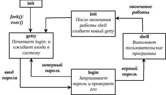 Далее ядро копирует "0" процесс и создает "1" процесс. Алгоритм создания этого процесса напоминает стандартную процедуру, хотя и носит упрощенный характер. Сначала процесс "1" представляет собой полную копию процесса "0" , т.е. у него нет области кода. Далее происходит увеличение его размера и во вновь созданную кодовую область копируется программа, реализующая системный вызов exec(), необходимый для выполнения программы /etc/init. На этом завершается подготовка первых двух процессов. Первый из них представляет собой структуру данных, при помощи которой ядро организует мультипрограммный режим и управление процессами. Второй – это уже подобие реального процесса. Далее ОС переходит к выполнению программ диспетчера. Диспетчер наделен обычными функциями и на первом этапе у него нет выбора – он запускает exec(), который заменит команды процесса "1" кодом, содержащимся в файле /etc/init. Получившийся процесс, называемый init, призван настраивать структуры процессов системы. Далее он подключает интерпретатор команд к системной консоли. Так возникает однопользовательский режим, так как консоль регистрируется с корневыми привилегиями и доступ по каким-либо другим линиям связи невозможен. При выходе из однопользовательского режима init создает многопользовательскую среду. С этой целью для каждого активного канала связи, т.е. каждого терминала, init создает отдельный процесс, выполняющий команду getty. Эта программа ожидает входа в систему кого-либо по каналу связи. Далее, используя системный вызов exec(), getty передает управление программе login, проверяющей пароль. Во время работы ОС процесс init ожидает завершения одного из порожденных им процессов (т.е. окончания сессии работы с системой), после чего он активизируется и создает для соответствующего терминала новый процесс getty взамен завершившегося . Таким образом, процесс init поддерживает многопользовательскую структуру во время функционирования системы. Схема описанного “круговорота” представлена на Рис. 13
