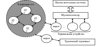 Терминальные комплексы можно разделить на локальные и удаленные. Локальные терминальные ТК имеют либо непосредственное подключение к ВС по локальному каналу связи, либо подключение через мультиплексор (устройство, позволяющее свести N каналов в один). Удаленные ТК подключаются к ВС через коммуникационную среду. Изначально этой средой являлись обычные телефонные сети, которые исторически основывались на аналоговом способе передачи информации; компьютерные сети основаны на цифровом (дискретном) способе передачи данных. Для передачи цифровой информации через аналоговые сети необходимы аналогово-цифровой и цифро-аналоговый преобразователи (модем — модулятор-демодулятор). Таким образом, для удаленного соединения необходимы, как минимум, два модема.