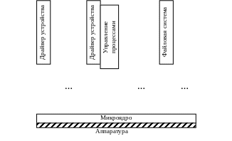 Третий подход предлагает использовать микроядерную архитектуру (Рис. 66.). Функционирование операционных систем подобного типа основывается на использовании т.н. микроядра. В этом случае выделяется минимальный набор функций, которые включаются в ядро. Все оставшиеся функции представляются в виде драйверов, которые подключаются к ядру посредством некоторого стандартного интерфейса.