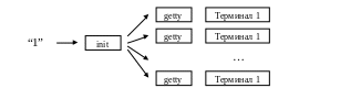 Итак, в итоге в рамках первого процесса сформирован процесс init, который существует в системе также на протяжении всего ее функционирования. Процесс init поддерживает соответствующую стратегию организации работы системы: либо это однопользовательская система, либо многопользовательская. Эта стратегия определяется параметрами, которые возникают на стадии загрузки ядра и инициализации системы. Соответственно, система опознает один из подключенных терминалов как системную консоль. Если система однопользовательская, то происходит подключение интерпретатора команд к системной консоли. Если же режим многопользовательский, то процесс init обращается к системной таблице терминалов, хранящей все терминальные устройства, которые могут быть в системе, и для каждого готового к работе терминала из юэтого перечня он запускает процесс getty. Процесс getty — это процесс, который обеспечивает работу конкретного терминала. Заметим, что процесс init создает процесс getty уже стандартным способом, и после вообще все процессы создаются лишь по схеме fork-exec.