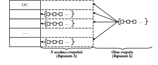 Существуют концептуально два варианта организации этой очереди. Первый вариант (вариант Б) предполагает наличие единственной сквозной очереди, которая по каким-то соображениям распределяется между этими разделами. Второй вариант (вариант А) организован так, что с каждым разделом ассоциируется своя очередь, и поступающий процесс сразу попадает в одну из этих очередей.