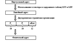 Преобразование виртуального адреса в физический имеет достаточно простую организацию (Рис. 133.). На основе виртуального адреса посредством использования информации из таблиц LDT и GDT получается 32-разрядный линейный адрес, который интерпретируется в терминах двухуровневой иерархической страничной организации. Последние 12 разрядов отводится под смещение в физической странице, а первые 20 разрядов интерпретируют, как 10-разрядный индекс во «внешней» таблице групп страниц и 10-разрядное смещение в соответствующей таблице второго уровня иерархии.