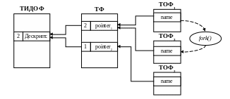 Теперь предположим, что после открытия файла name, Процесс1 обращается к системному вызову fork() и порождает своего потомка — Процесс3. При обращении к системному вызову fork() ТОФ родительского процесса копируется в ТОФ сыновнего процесса. Соответственно, все записи ТОФ3 будут ссылаться на те же записи ТФ, что и записи ТОФ1. Это означает, что при порождении сыновнего процесса в соответствующих записях ТФ происходит увеличение на 1 счетчика кратности. Заметим, что подобный механизм наследования подразумевает, что дочерний процесс будет работать с теми же указателями чтения/записи, что и родительский процесс.