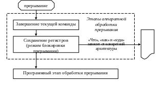 Обработка прерывания предполагает остановку выполнения текущей программы, запуск специальной программы обработки прерывания, а затем, возможно, продолжение выполнения прерванной программы. Поэтому аппаратный этап обработки прерываний регламентирует перечень регистров, которые автоматически будут сохранены процессором. Это специальные регистры, содержимое которых описывает состояние процессора в точке прерывания выполнения программы (счетчик команд, регистр результатов, регистры, содержащие режимы работы процессора), а также несколько регистров общего назначения, которые могут быть использованы программой обработки прерываний в начальный момент времени. Процедура аппаратного сохранения регистров в различных компьютерах может происходить по-разному. Простейшая модель следующая. Включается режим блокировки прерываний. При этом режиме в системе запрещается инициализация новых прерываний: возникающие в это время прерывания могут либо игнорироваться, либо откладываться (зависит от конкретной аппаратуры компьютера и типа прерывания).