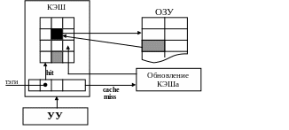 Каждому блоку КЭШа ставится в соответствие адресный тег, по содержимому которого возможно однозначно адресовать содержимое блока. Таким образом, после вычисления исполнительного адреса операнда или команды устройство управления может определить, находится ли соответствующая информация в одном из блоков КЭШ-памяти или нет. Факт нахождения искомых данных в КЭШе называется попаданием (hit). Если искомых данных нет в КЭШе, то фиксируется промах (cache miss).