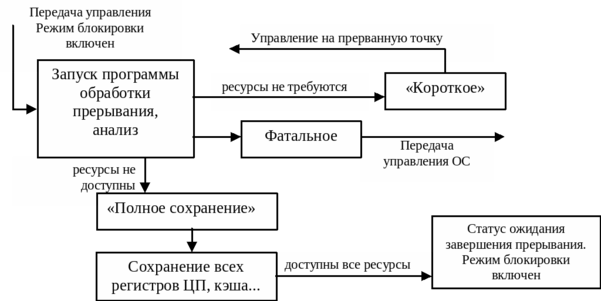 Если прерывание «короткое», т.е. обработка не требует дополнительных ресурсов ЦП и времени, то прерывание обрабатывается, выключается режим блокировки прерываний, восстанавливается состояние процессора, соответствующее точке прерывания исходной программы, и передается управление на прерванную точку. Примером подобного «короткого» прерывания может служить прерывание от таймера для коррекции времени в системе. Если прерывание требует использования всех ресурсов ЦП, то переходим к следующему шагу (п.2).