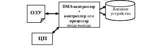 Затем исторически появились т.н. контроллеры прямого доступа к памяти (DMA — Direct Memory Access, Рис. 41.). Контроллеры данного типа исключили центральный процессор из обработки потока данных, взяв эту функцию на себя. В данной модели предполагается, что центральный процессор занимается лишь обработкой потоком управляющей информации, а данные перемещаются между ВЗУ и ОЗУ уже без его участия.
