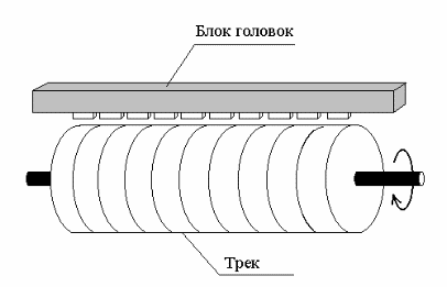 Имеется металлический цилиндр большой массы, вращающийся вокруг своей оси. Роль большой массы - поддержание стабильной скорости вращения. Поверхность этого цилиндра покрыта магнитным слоем, позволяющим хранить, читать и записывать информацию. Поверхность барабана разделена на n равных частей (в виде колец), которые называются треками (track). Над барабаном расположен блок неподвижных головок так, что над каждым треком расположена одна и только одна головка. (Головок, соответственно, тоже n штук). Головки способны считывать и записывать информацию с барабана. Каждый трек разделен на равные сектора. В каждый момент времени в устройстве может работать только одна головка. Запись информации происходит по трекам барабана, начиная с определенного сектора. При заказе на обмен поступают следующие параметры: № трека, № сектора, объем информации.