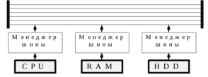 Происходит подключение устройств (включая CPU и RAM) через единую информационную магистраль. Каждое устройство, подключенное к этой магистрали (общей шине) имеет свой уникальный адрес.