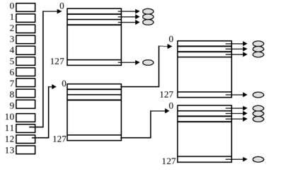 В том случае, если файл еще больше, то используется двенадцатый элемент поля адресации. Он содержит номер блока, в котором содержится 128 записей о номерах блоков, содержащих по 128 номеров блоков файловой системы, т. е. здесь используется двойная косвенность. Если файл еще больше, то используется тринадцатый элемент и используется тройная косвенность (аналогично двойной, но добавляется еще один уровень). Предельный размер файла (при размере блока 512) будет равен (128 + 1282 + 1283) * 512 байт = 1Гб + 8Мб + 64Кб > 1Гб.