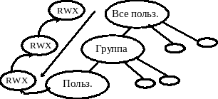 Любой пользователь принадлежит к группе. В соответствии с иерархией пользователей, определена иерархия защиты файлов и прав пользователей. Определено понятие владельца файла. Изначально владельцем файла является пользователь (а точнее, процесс пользователя), создавший этот файл. Атрибут «владелец файла» (user owner) может быть изменен командой changeown. Каждый файл имеет атрибуты защиты, связанные с иерархией. Есть права доступа к некоторым действиям файла со стороны владельца файла. Это права на чтение (read), на запись (write), на исполнение или интерпретацию (execution). У каждого файла, кроме прав, связанных с уровнем пользователя, имеются права, связанные с уровнем группы. Это права для всех пользователей группы, к которой принадлежит владелец файла, за исключением его самого (т.е. права владельца и его группы различны). Третья категория защиты - все остальные. Это те права, которые имеют все пользователи системы, за исключением владельца и его группы. В системе имеется команда изменения прав доступа changemode.