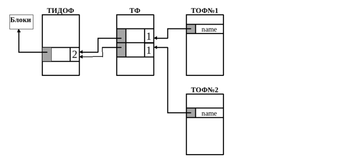 Пусть процесс №2 открывает тот же файл name. Этому файлу ставится в соответствие файловый дескриптор. Заполнится строка ТФ, содержащая атрибуты, связанные с данным открытием файла name, в т. ч. значение индекса наследственности будет равно 1. Эта строка ТФ сошлется на тот же ФД из ТИДОФ, что и строка ТФ, соответствующая открытию файла в процессе №1. Но значение поля открытых файлов в ТИДОФ увеличится на 1.